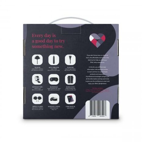 In de box vind je veel moois om elkaar te teasen en te verwennen. Geef elkaar een ontspannende massage met de heerlijk ruikende massagekaars. Blinddoek en boei jouw partner met het satijnen oogmasker en linten. Gebruik de flogger voor een plagerige tik op de billen. Prikkel de huid met de veren kietelaar. Ontdek hoeveel intensiteit jij kunt verdragen met de verstelbare tepelklemmen of ontneem iedere poging tot bewegen met het bondage tape. In de set vind je ook een krachtige bullet vibrator voor een heerlijke stimulatie op al jullie favoriete plekjes. De uitgebreide en eerlijk geschreven handleiding (Engelstalig) is tot stand gekomen in samenwerking met een ervaren seksuloog en staat boordevol uitleg, do's en dont's en maakt jullie zelfverzekerd genoeg om aan deze nieuwe ontdekkingstocht te beginnen!