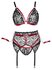 Deze set is perfect voor bondage spel! De set bestaat uit een BH, een high waist jarretelgordel en een bijpassende sexy string met open kruisje. De armbanden met kettingen geven deze set een uitdagende look. Maak de set af met een paar mooie kousen en voel je onweerstaanbaar.